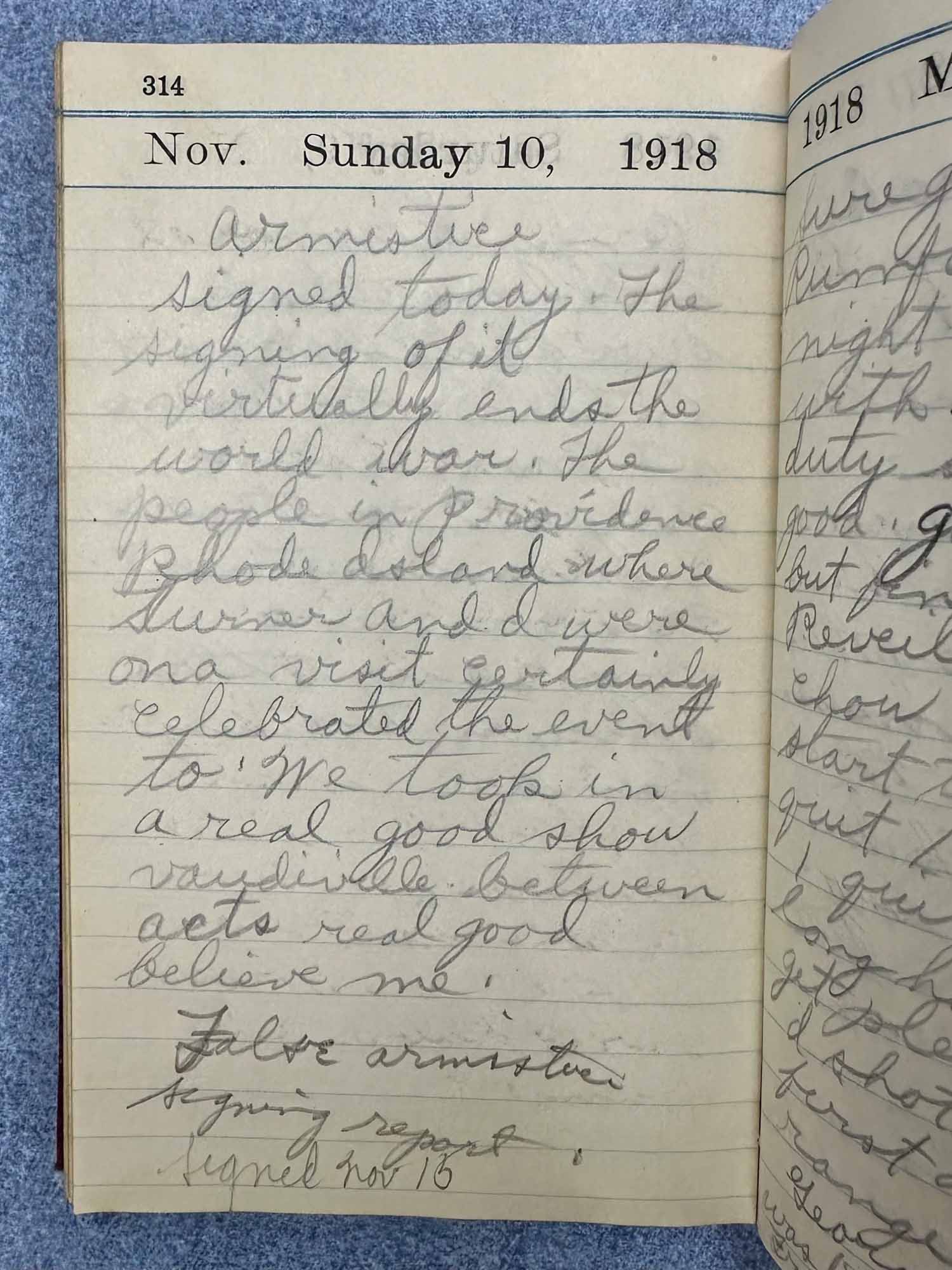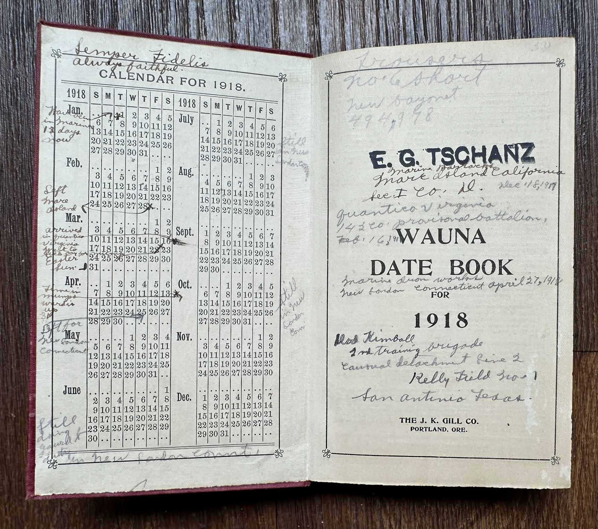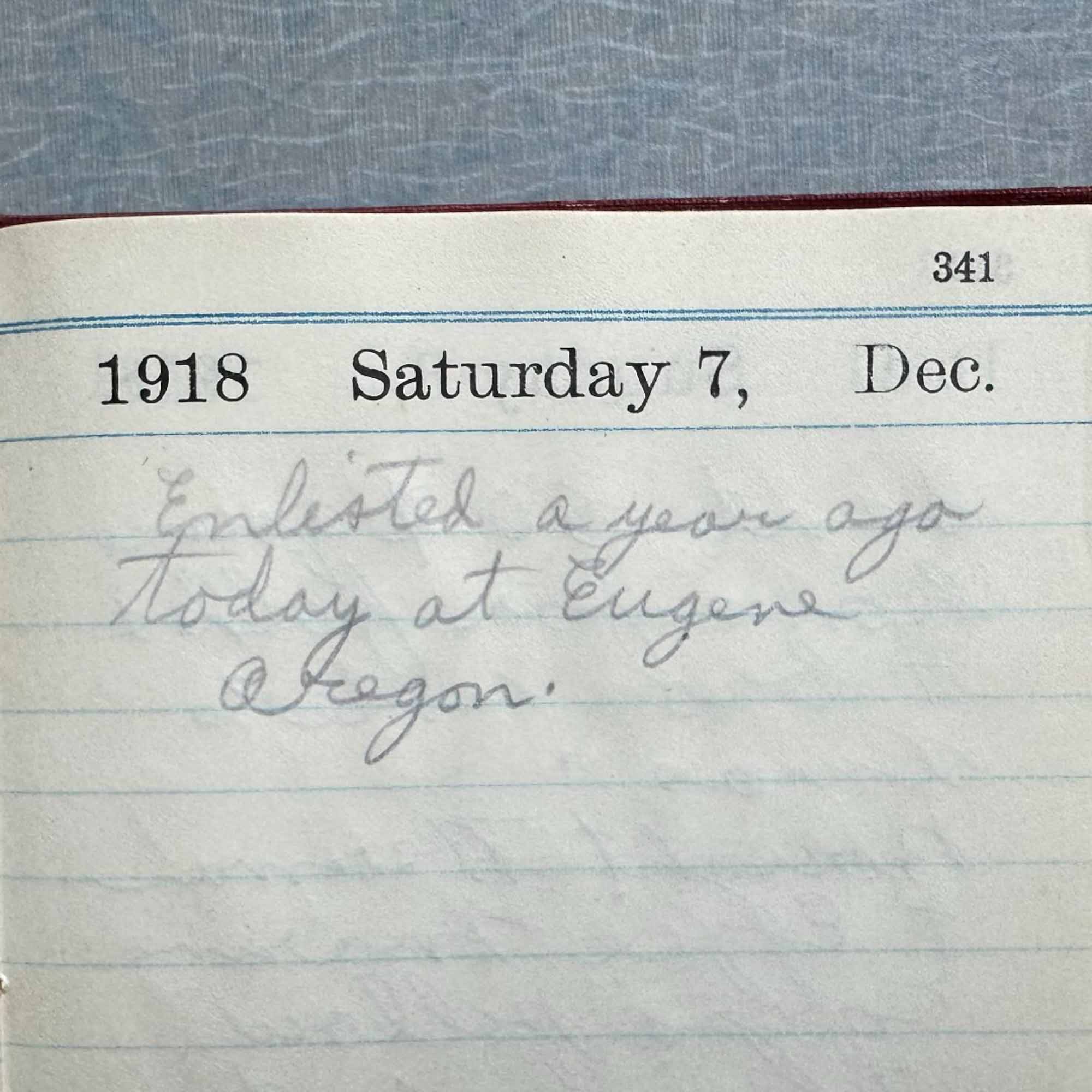 The Oregon Military Museum has officially accepted Jack’s donation of Emil G. Tschanz’s 1918 diary, along with other cherished artifacts. Emil enlisted in December 1917, and his diary offers vivid accounts of daily life during WWI — including details about staying connected to loved ones through letters, many meals that were enjoyed, travel, drills, loss, and reflections on the signing of the Armistice amidst cheerful Vaudeville performances.