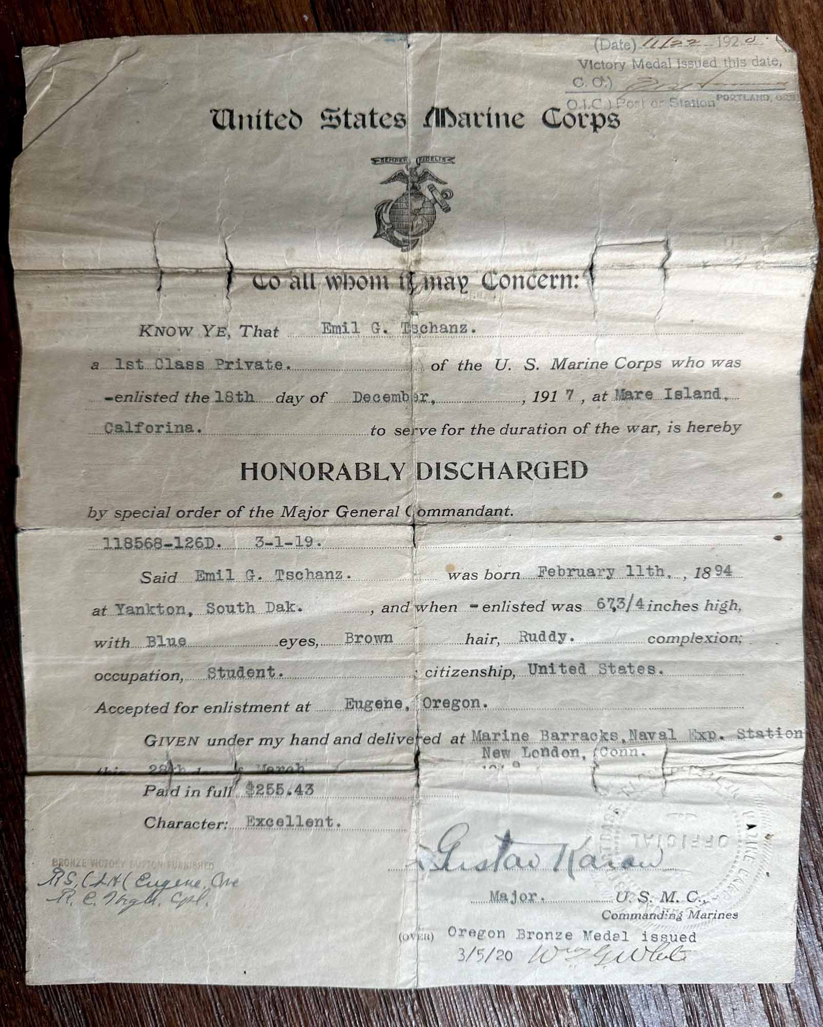 - Emil’s Marine Corps discharge letter, with notes on receiving his Victory Medal and Oregon Bronze Medal